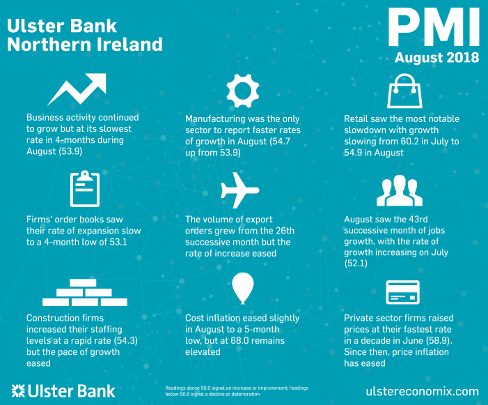 The headline seasonally adjusted Business Activity Index fell to 53.9 in August from 56.6 in July. The rate of growth was solid and output has now risen in Northern Ireland in each of the past 23 months, but the latest month signalled the weakest expansion since April.