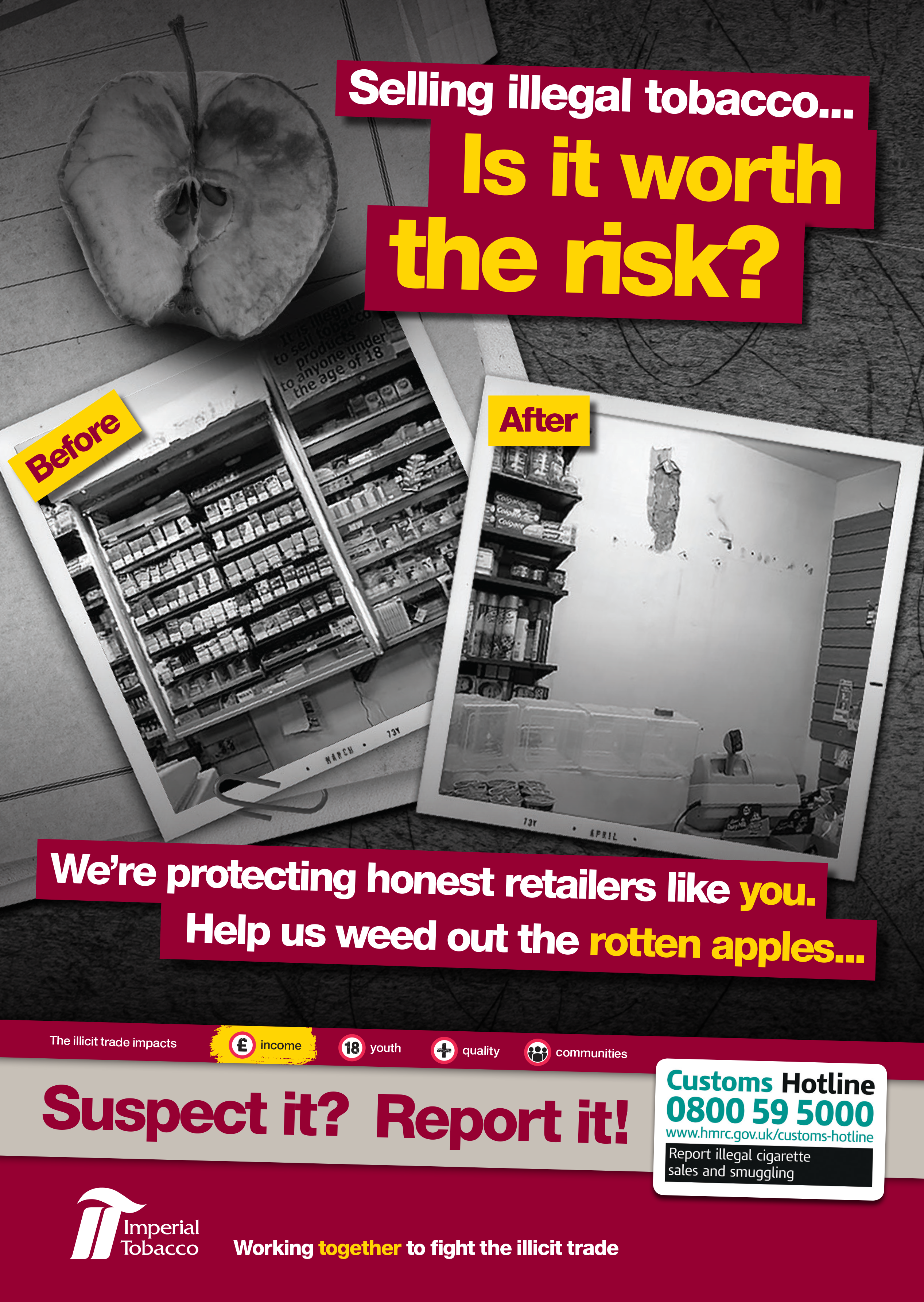 It is the latest instalment of Imperial’s ‘Suspect it? Report it!’ campaign, and features an ‘after’ photo of the bare wall from where the cigarettes were originally sold.