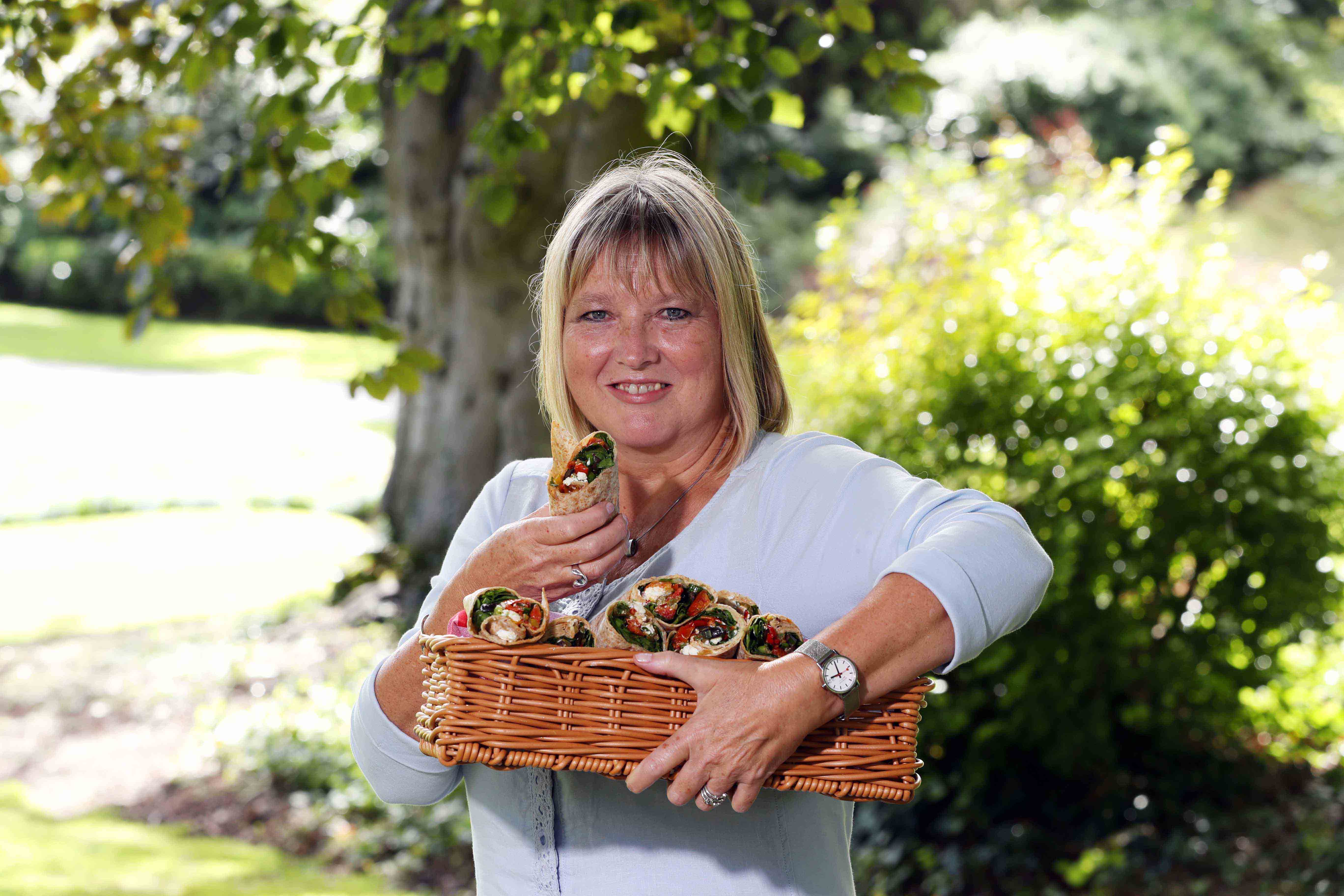 NI woman, Lorraine Surgin with her hummus, spinach leaves, sun blushed tomatoes, roasted peppers, scallions, olives and feta cheese in a soft tortilla wrap.