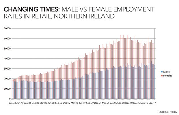 Statistics collected by research body the Northern Ireland Statistics and Research Agency (Nisra) dating back to June 1971, show a significant increase in retail employment and heavier reliance on women in the sector.